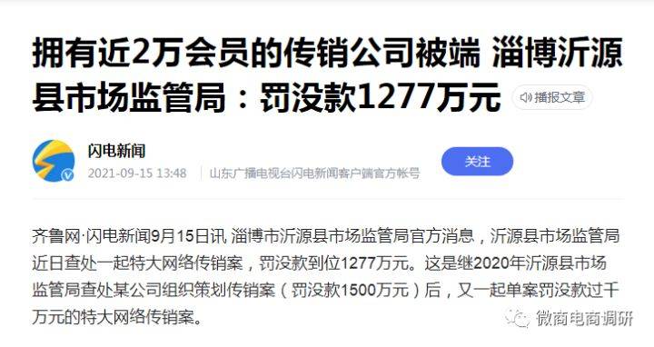 此外,微商电商调研还了解到,齐鲁网·闪电新闻于2021年9月15日发布文章《拥有近2万会员的传销公司被端 淄博沂源县市场监管局:罚没款1277万元》。