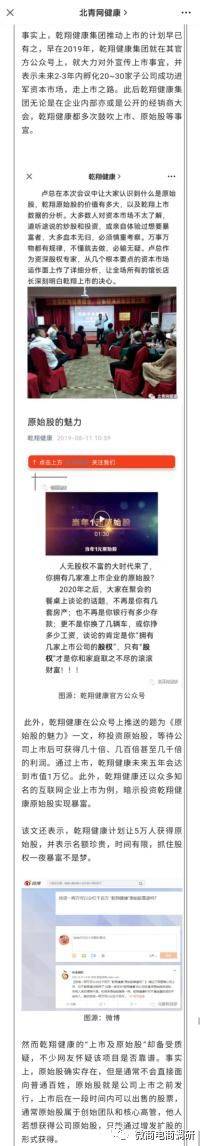 然而,对于乾翔健康上市一事,早已有人质疑其是为了卖原始股。据北青网健康报道,早在2019年,乾翔健康集团就在其官方公众号上,大力对外宣传上市事宜,并表示未来2-3年内孵化20-30家子公司成功进军资本市场,走上市之路。此后乾翔健康集团无论是在企业内部亦或是公开的经销商大会,都多次鼓吹上市、原始股等事宜。