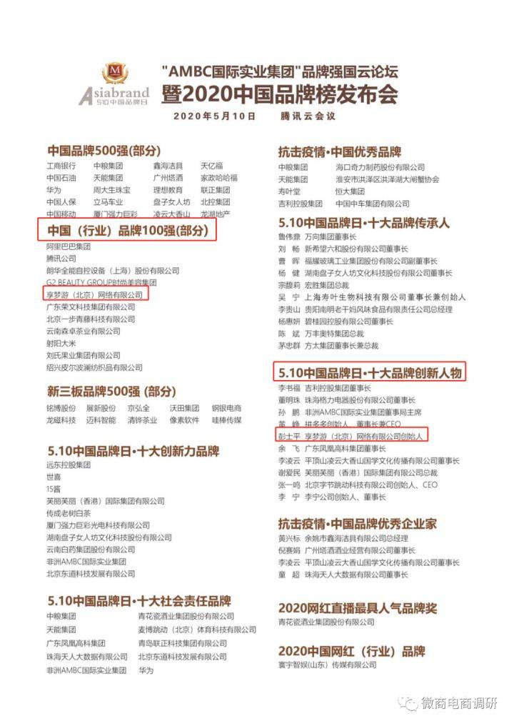 在上图中的最新加入企业中,还有一家名为“享梦游”的公司。微商电商调研了解到,享梦游曾在2020年的“‘AMBC国际实业集团’品牌强国论坛暨2020中国品牌榜发布会”中获得“中国(行业)品牌100强”,其创始人彭士平获得“510·十大品牌创始人”。