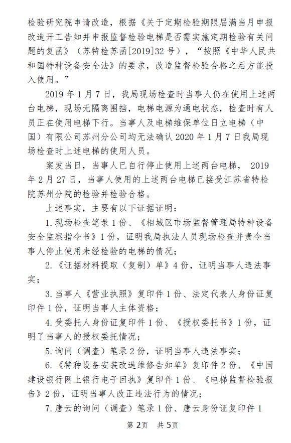 案发当日,当事人苏州竣景地产已自行停止使用上述两台电梯,2019年2月27日,当事人使用的上述两台电梯已接受江苏省特检院苏州分院的检验并检验合格。