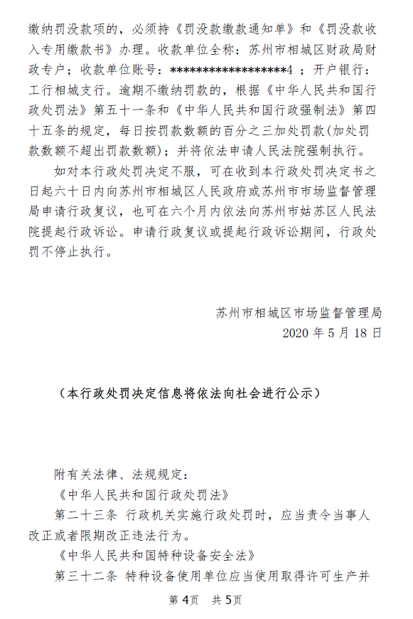 综上,苏州竣景地产的上述行为,违反了《中华人民共和国特种设备安全法》第三十二条第一款之规定。根据《中华人民共和国行政处罚法》第二十三条和《中华人民共和国特种设备安全法》第八十四条第一项之规定,责令当事人立即改正违法行为,并决定对苏州竣景地产处罚款5万元,上缴国库。