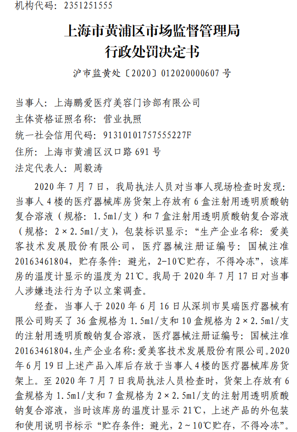 近日,上海药监局披露的行政处罚决定书(沪市监黄处〔2020〕012020000607 号)显示,上海鹏爱医疗美容门诊部有限公司未按照医疗器械说明书和标签标示要求贮存医疗器械的行为违反了《医疗器械监督管理条例》的有关规定。上海市黄浦区市场监督管理局对上海鹏爱医疗美容门诊部有限公司罚款人民币20000元。