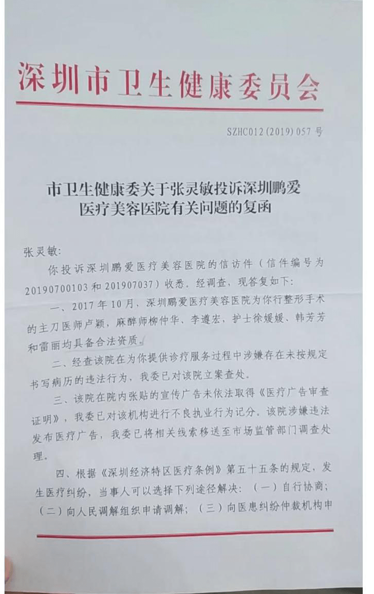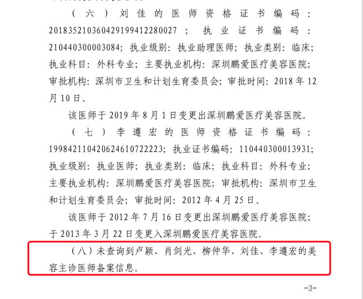 对此,张灵敏向记者出示了一份深圳市卫生健康委员会SZHC012(2020)439号《深圳市卫生健康委关于答复王城申请政府信息公开的函》,其中载明,未查询到卢颖、肖剑光、柳仲华、刘佳、李遵宏的美容主诊医师备案信息。未查询到王苓的护士执业注册信息。