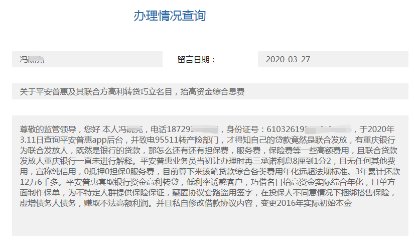 今年3月27日,冯先生在广东省地方金融监督管理局互动交流版块投诉称,于2020年3月11日查询平安普惠app后台,并致电95511转产险部门,才得知自己的贷款竟然是联合发放,有重庆银行为联合发放人。其质疑:“既然是银行的贷款,那怎么还有还有担保费,服务费,保险费等一些高额费用,且联合贷款发放人重庆银行一直未进行解释。”