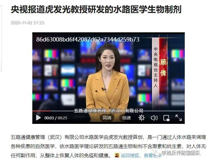 我们在网上搜索“水路医学”,其宣传文章基本都出自于一些小网站小自媒体号。有一篇题为“央视报道虎发光教授研发的水路医学生物制剂”的视频,从视频上丝毫看不到央视的图标,更不像是哪个央视节目。就直接说是央视报道完全属于虚假宣传,这就好像我去了一趟清华大学拍了张照片,我就对外吹嘘我是清华学子。(我们怀疑是找了央视主持人顾倩录制一条视频广告,也可能其主持人就不是顾倩。)