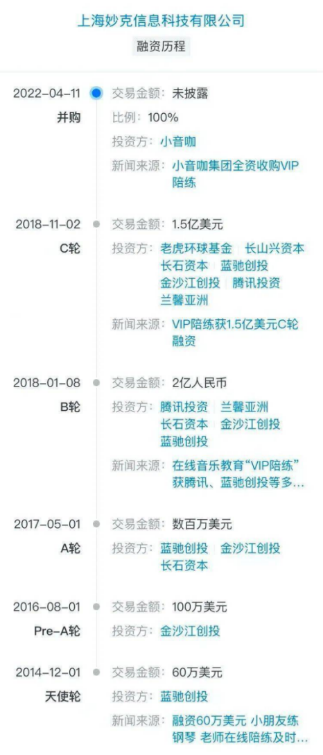 成立于2014年的VIP陪练,一度被视作在线音乐教育赛道独角兽,上百万学员及数万师资遍布世界各国。公司曾在3年间获4轮超26亿融资,腾讯、金沙江、老虎环球等明星资本多轮跟投,2020年还曾传出可能上市。