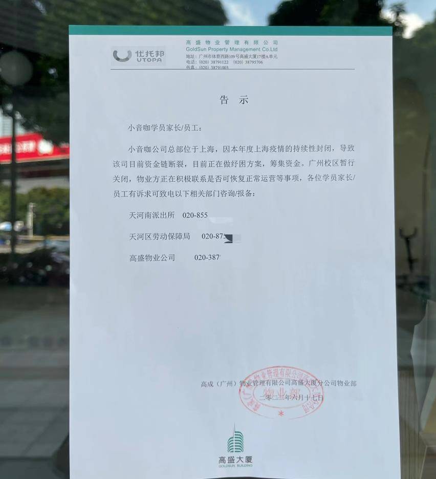 (小音咖广州校区门口张贴的通知 时代周报记者摄)