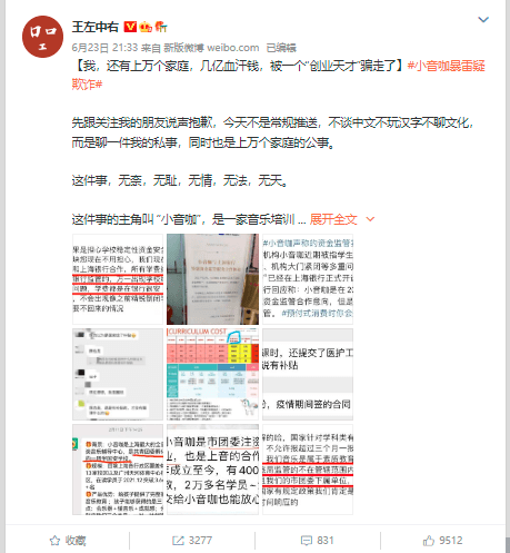 昨日深夜(6月23日),百万粉丝大V“王左中右”在其个人社交平台发文控诉维权。控诉长文显示,虽然据“王左中右”只在小音咖买了2万多块的课,但更多的家长,他们预交的学费少则上万,多则几十万,很多才上了几节课,便遇到小音咖暴雷。