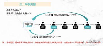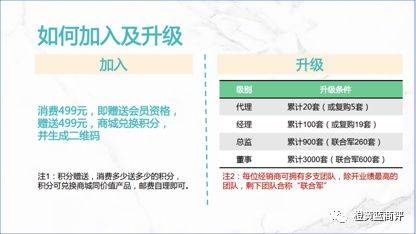 如何升级成经销商。当累计出货20套(或复购5套)可成为代理级别;累计出货100套(或复购19套)可成为经理级别;累计出货900套(联合军260套)可成为总监;累计出货3000套(联合军600套)可成为董事。每位经销商可拥有多支团队,除业绩最高的团队,剩下的团队合称为“联合军”。