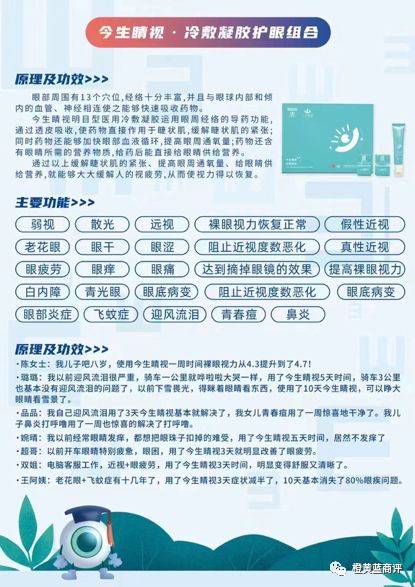 据经销商发给本网的宣传资料显示,今生睛视护眼组合的适用的范围极为广泛,其功效有:调理和改善近视,弱视,远视,散光,老花眼,白内障,青光眼,眼疲劳,眼睛肿胀,眼睛干涩等症状,还能缓解视力下降,增强眼部抵抗力,淡化鱼尾纹,祛除黑眼袋,黑眼圈,迎风流泪等作用,除此之外,本网还发现该产品对青春痘、鼻炎甚至都有疗理功能。