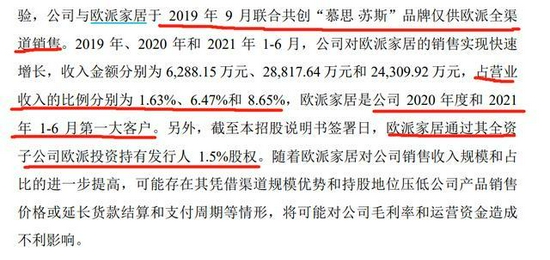 慕思股份也提示,随着欧派家居对公司销售收入规模和占比的进一步提高,可能存在其凭借渠道规模优势和持股地位压低公司产品销售价格或延长货款结算和支付周期等情形,将可能对公司毛利率和运营资金造成不利影响。