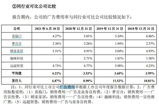招股书显示,2018-2021年6月,慕思的广告费远高于同行。