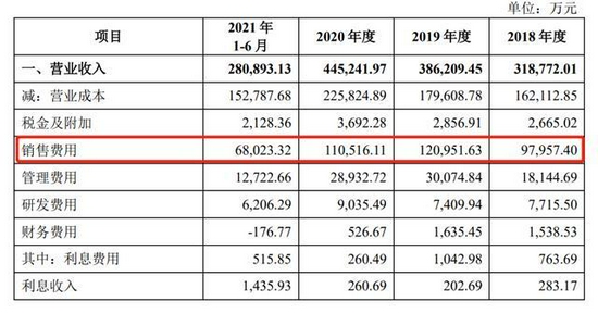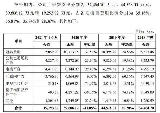 2018年- 2021年上半年,公司广告费分别为3.45亿元、4.45亿元、3.96亿元、1.93亿元。广告开支中最大的两个场景,分别是冠名赞助和公共交通广告。报告期内,公司广告费用占营业收入的比例分别为10.81%、11.53%、8.90%和6.87%,远超行业整体水平。
