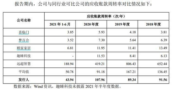 同时, 慕思 股份还在招股中表示,公司主要对直供客户采用赊销的结算政策。或出于此原因, 慕思 股份的应收账款周转率是同行业一些企业均值的十余倍。