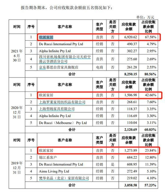 不过,此番“捆绑”对于 慕思 股份来说也是把“双刃剑”,这从公司2020年42.66%,2021年上半年67.58%的应收账款都来自欧派家居中或许能看出一二。