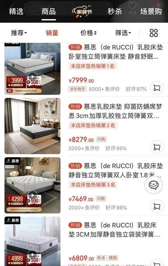据红星资本局实地走访家居市场发现,慕思床垫往往与进口品牌摆在同一区域,标价昂贵,超过万元甚至数万元的床垫也不在少数。在天猫、京东旗舰店上,卖得最好的慕思床垫普遍售价七八千元。