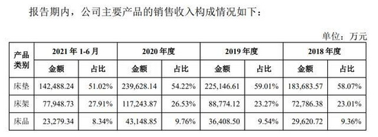 其中床垫销售收入占公司营收50%以上,2020年床垫销售收入达到近24亿元。是公司的“拳头产品”。