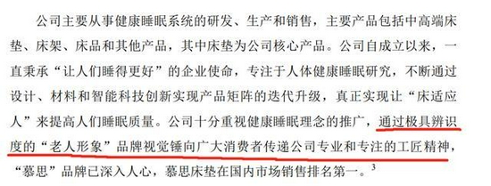 慕斯股份曾在招股书中表示“公司十分重视健康睡眠理念的推广,通过极具辨识度的‘老人形象’品牌视觉锤向广大消费者传递公司专业和专注的工匠精神,‘慕思’品牌已深入人心,慕思床垫在国内市场销售排名第一。”