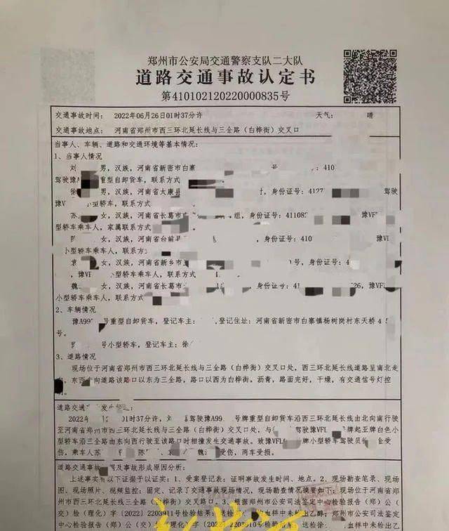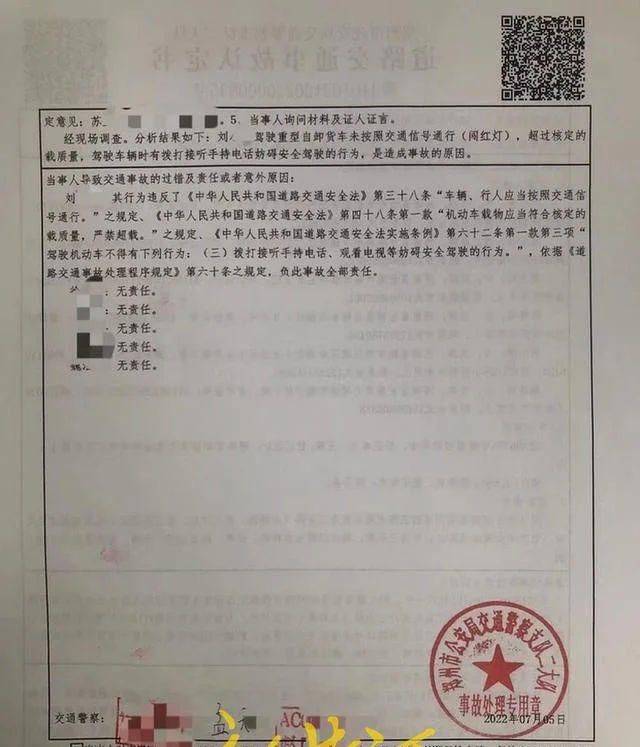 对于此事,高德打车平台向记者提供了郑州市公安局交通警察支队认定的责任书。责任书显示,刘某驾驶重型自卸货车未按照交通信号灯通行,超过核定的载重量,驾驶车辆时有拨打接听手持电话妨碍安全驾驶的行为,是造成事故的原因。事故中小型轿车正常行驶,驾驶员徐某对此事故无责任。