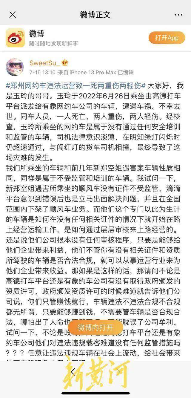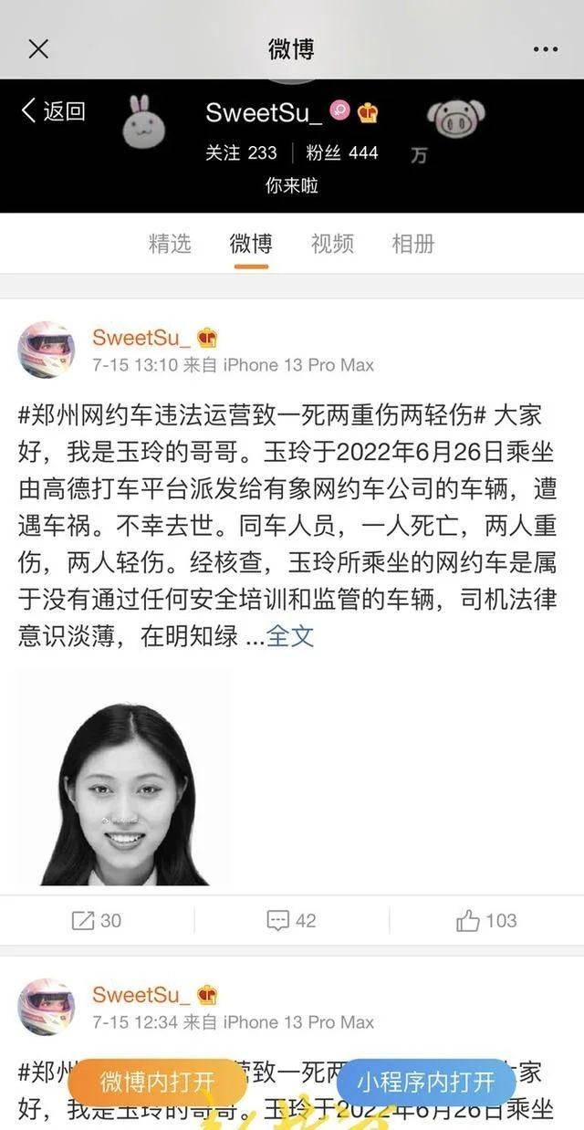 郑州女大学生苏玉玲发的最后一条微博停留在了6月25日的16:26,发这条信息时她还和朋友们开心地在一起。谁也没想到,6月26日,她和朋友在郑州乘坐由高德打车平台派发给“有象约车”的网约车时遭遇车祸,不幸去世,同车人员还有两人重伤,两人轻伤。