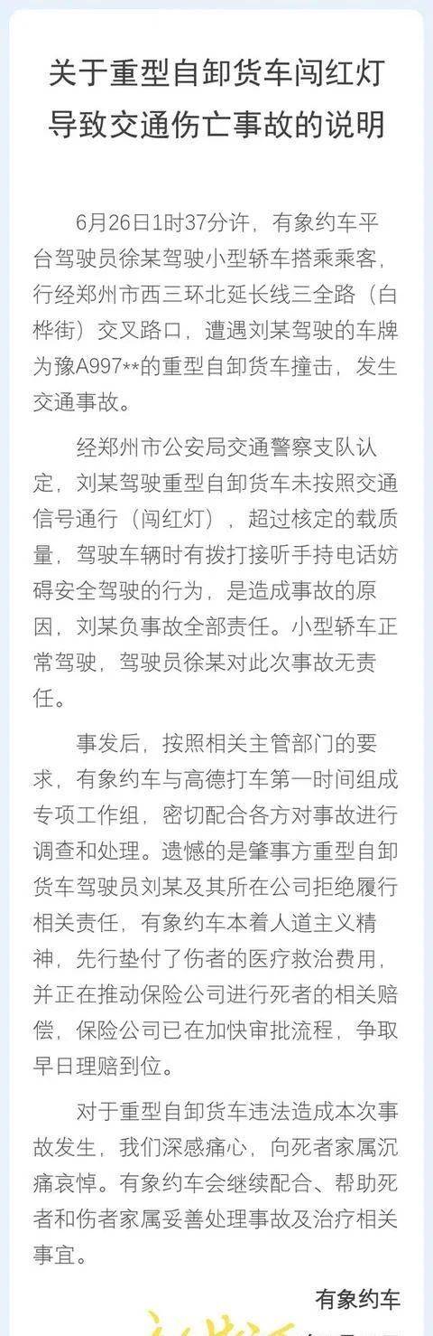 高德打车平台表示,事发后,按照相关主管部门的要求,“有象约车”与高德打车第一时间组成专项工作组,密切配合各方对事故进行调查和处理。但因肇事方重型自卸货车驾驶员刘某及其所在公司拒绝履行相关责任,“有象约车”先行垫付了伤者的医疗救治费用,并正在推动保险公司进行死者的相关赔偿,保险公司已在加快审批流程,争取早日理赔到位。