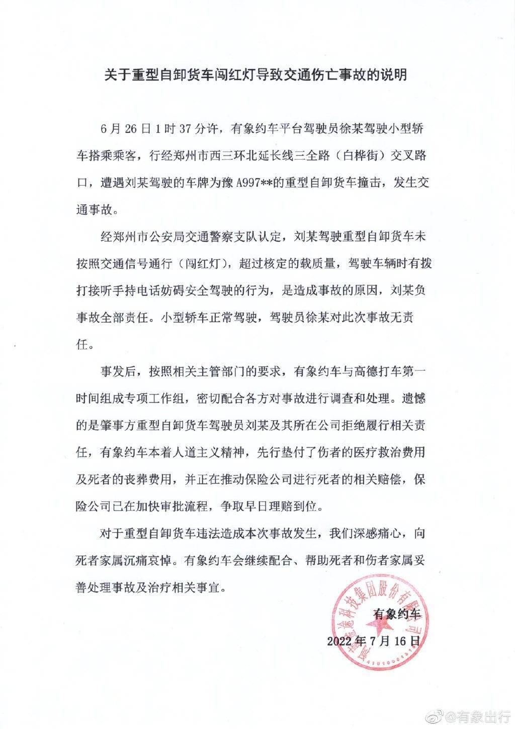 对此,有象出行今日发布关于重型自卸货车闯红灯导致交通伤亡事故的说明:6月26日1时37分许,有象约车平台驾驶员徐某驾驶小型轿车搭乘乘客,行经郑州市西三环北延长线三全路(白桦街)交叉路口,遭遇刘某驾驶的车牌为豫A997**的重型自卸货车撞击,发生交通事故。