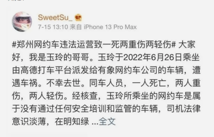 7月15日,苏某某哥哥用妹妹的微博账号发布消息称,此次事故发生后,交警也对事故责任进行了判定,经核查,苏玉玲所乘坐的网约车是属于没有通过任何安全培训和监管的车辆,司机属于无证上路,与闯红灯的货车司机相撞,导致了事故的发生。