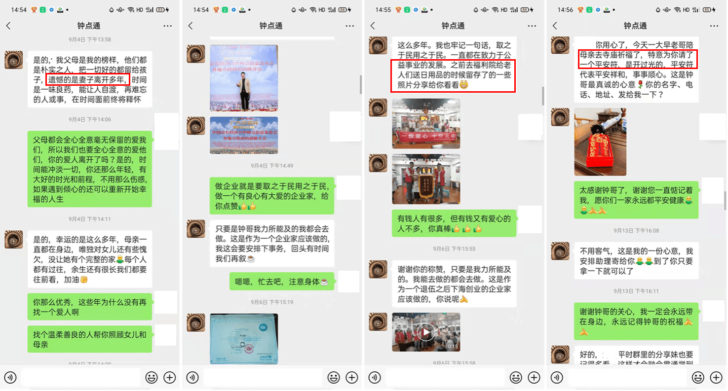 钟点通每天都给张女士发一些关心问候的话,还称与母亲到寺里拜佛为张女士祈福并分享给张女士,时常发一些做慈善的照片及联合国儿童基金会的来信。