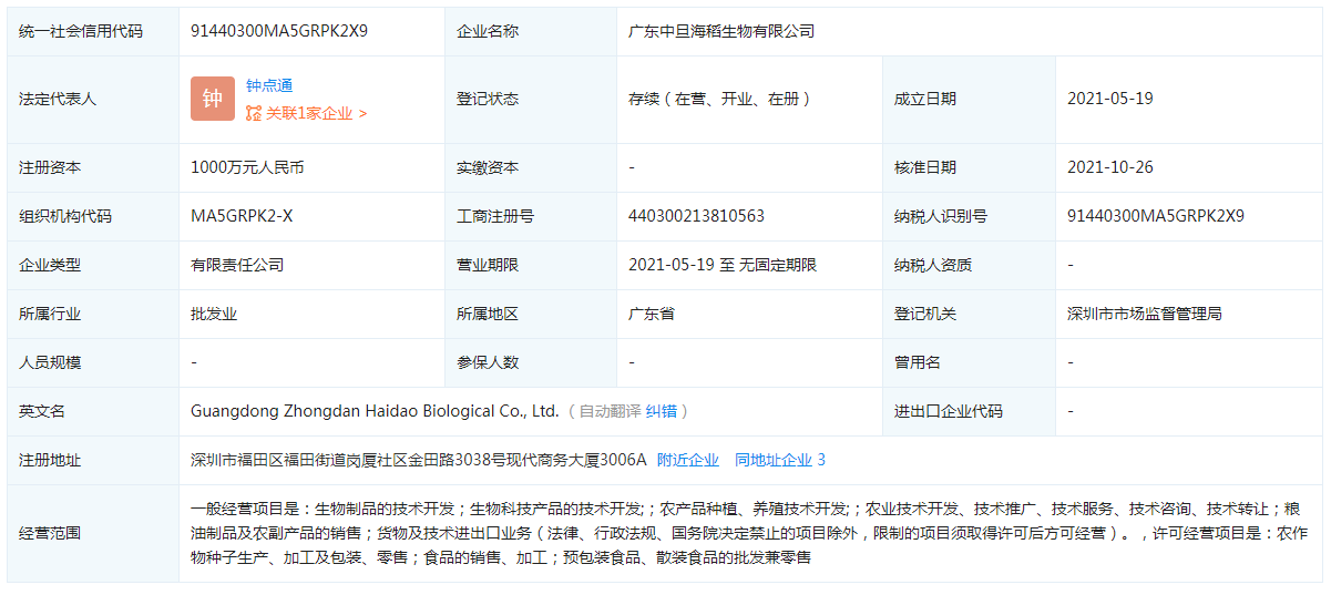 李旭反传销团队通过张女士提供的信息了解到,广东中旦海稻生物有限公司是今年5月份才成立的一家新公司,法人代表是钟点通,注册资金显示为1000万元人民币,而实缴注册资金为0元。
