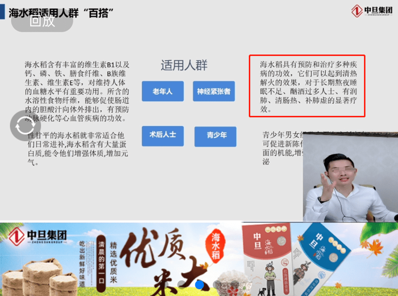 群里非常热闹,每天都有人说一些励志和称赞钟点通(钟哥)的话,随后钟点通开通直播,让张女士也观看,直播的内容主要分为两部分:第一部分是钟点通创业的历程,第二部分是宣传他们的产品——中旦海水稻。
