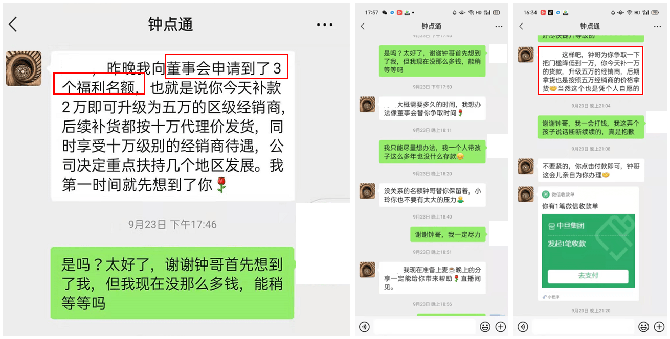 9月23日,钟点通特意留言,讲他跟董事会申请了3个福利名额,你被选中,只需要再补齐两万元货款,即可升级为五万元的代理商,后续补货案有十万元代理商的待遇。