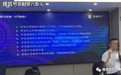 但据金律头条报道,冠商天下作为一个平台,通过给商家和消费者进行消费返利的模式运作。消费者在该平台消费,可获得全额积分返还,商家向平台上缴一定比例,也可以获得双倍积分返还。该平台在拉人加入成为vip商家,成为vip商家可以获得各类型积分返利,还可以拉人头提佣金。vip商家拉代理可以获得20%的奖励,即便是间接拉人头也可以获得10%的提成,还可以获得所拉人头的消费流水奖励提成。