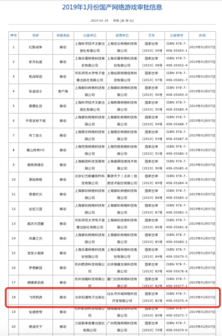 记者从国家新闻出版署官网查询发现,2019年1月份发放的国产网络游戏审批信息就包含了《飞吧西游》,其出版单位是北京伯通电子出版社,运营单位是汕头市天域网络科技开发有限公司(下称“汕头天域”)。