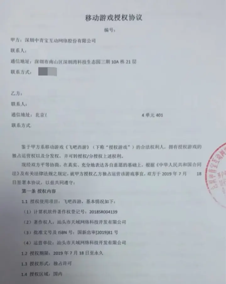 记者获得了这份协议,其中显示,中青宝作为授权方,为《飞吧西游》的权利人,拥有《飞吧西游》的独占运营权及分发权,张青一方被授权独占运营《飞吧西游》。本次授权费用为40万元整,授权形式为独占许可,期限为签订协议之日起至永久。