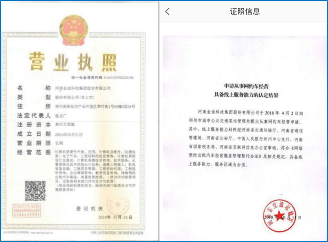 高德打车披露的网约车平台证照显示,河南金途科技集团股份有限公司于2018年4月向郑州市公共交通客运管理处提出网约车经营申请,于2018年10月获得审批通过,经营范围为全国。
