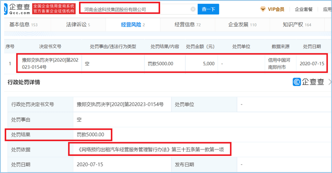 2020年7月15日,郑州市交通运输综合行政执法支队出具的处罚书显示,河南金途科技集团股份有限公司被罚款5000元,原因为违反了《网络预约出租汽车经营服务管理暂行办法》第三十五条第一款第一项,即“提供服务车辆未取得《网络预约出租汽车运输证》,或者线上提供服务车辆与线下实际提供服务车辆不一致的;”
