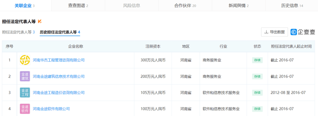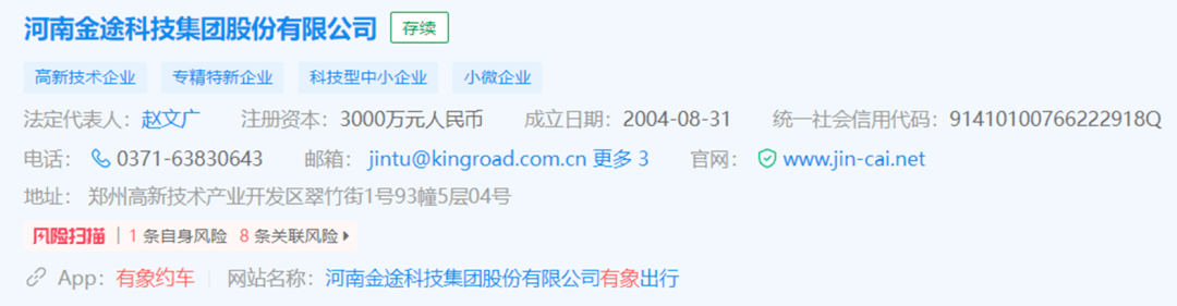 公开资料显示,河南金途科技集团股份有限公司成立于2002年,注册资本与实缴资本均为3000万元,法定代表人为赵文广。该公司公开介绍称,其曾承担河南省道路运输局营运客车服务质量监督平台——“安全行”项目及“河南省出租车二维码乘客监督服务质量平台”项目;还成功研发了《河南道路建设项目各阶段造价数据系统》以及《河南省交通运输项目综合电子招投标系统》,河南金途科技称,后者极大地提高了全省交通工程招标的工作效率,最大限度的避免了招标工作中人为因素的干预。