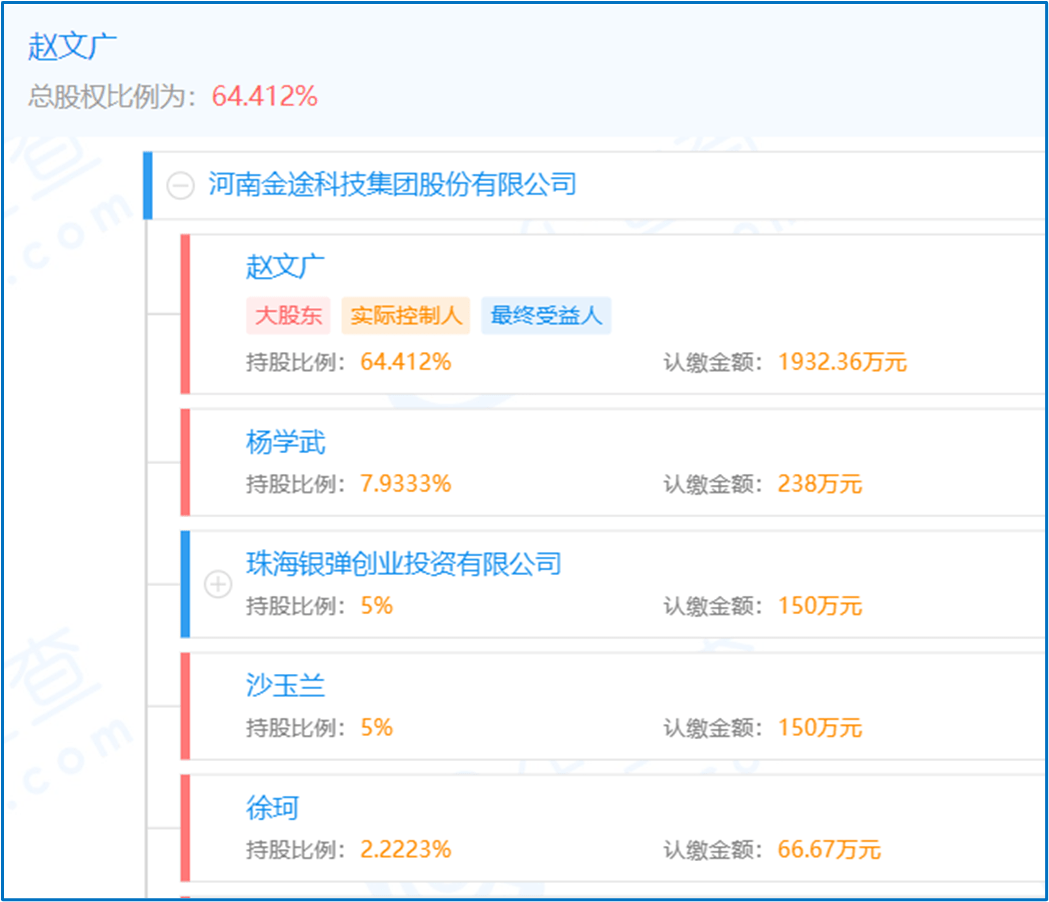 企查查显示,河南金途科技的股东大部分为自然人,其中赵文广持股64.41%,为大股东。