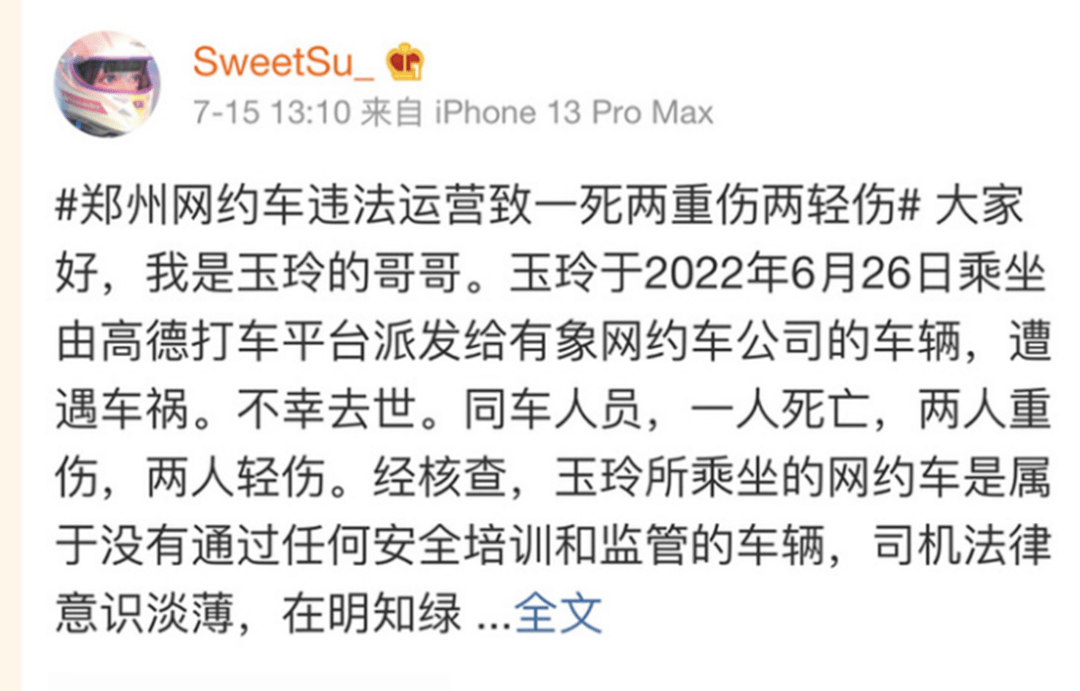 6月26日,郑州女大学生苏玉玲和朋友乘坐高德打车平台推荐的“有象约车”途中遭遇车祸,不幸身亡,同行人员另有2人重伤,2人轻伤。
