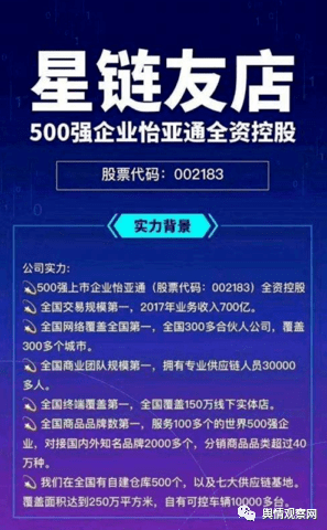 近年来,不法分子借“科创板”“创业板”“纳斯达克”等概念炒作,编造购买股权可到沪深股市或境外交易所上市的骗局又有所升温。这其中就有一家名为“星链友店”的平台,该平台宣传母公司是深圳怡亚通,“2007年主板上市,股票代码002183,2018年被深圳国资委控股,每年营业额一千多亿元。”