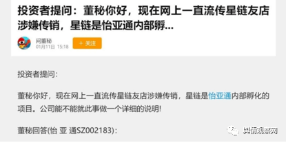更让人匪夷所思的是,今年1月11日,有投资者向怡亚通(002183)提问,董秘你好,现在网上一直流传星链友店涉嫌传销,星链是怡亚通内部孵化的项目。公司能不能就此事做一个详细的说明!公司回答表示,投资者您好,怡亚通及旗下子公司星链与星链友店没有任何股权关系。感谢您的关注。