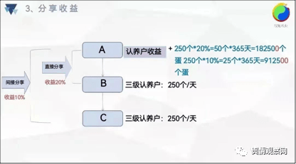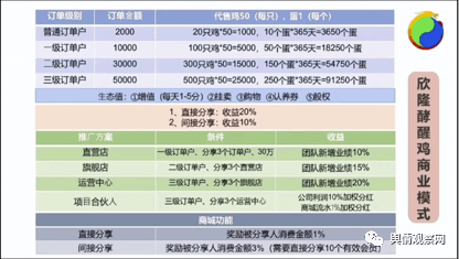 知情网友透露:该项目以认养鸡为名,依据投资金额不同门槛,设定普通认养户、一级认养户、二级认养户、三级认养户,设定不同等级的日收益和年收益。通过直接分享获得20%收益,间接分享获得10%收益。在开店补贴中,设置直营店、旗舰店、运营中心、项目合伙人体系,但是需要满足推荐分享要求,才能获得团队新增业绩不同比列的分红。