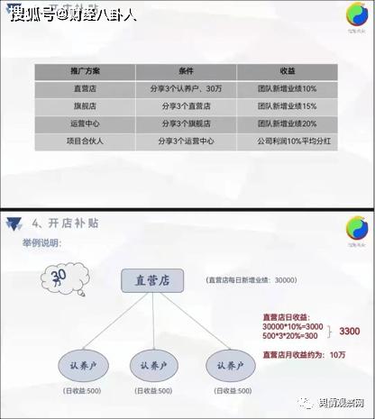 发展团队后还能升级成为直营店、旗舰店、运营中心和项目合伙人,到了这些级别就能拿到“新增认养金额”的奖励,这个奖励也就是团队新增业绩奖励,直营店是10%、旗舰店是15%、运营中心是20%,项目合伙人拿到的则是公司利润10%平均分红和商城流水1%的平均分红。