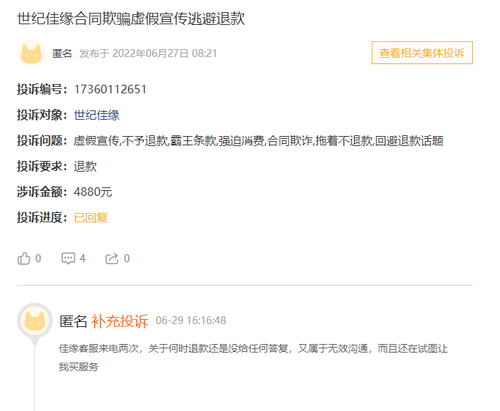此外,另有用户表示,其充值了世纪佳缘4880元的豪华版金钻牵线服务费,6月20日向销售红娘提出退全款,对方不接微信语音电话,至今回避退款。付费前,红娘表示每日推荐区的会员都是经人工筛选,且和男方沟通后才推荐的。付费后,虽然用户在金钻牵线的择偶条件里进行了设置,但18~21号出现在每日推荐区的男士 全是不符合要求的虚假账号,因此用户认为世纪佳缘存在虚假宣传。