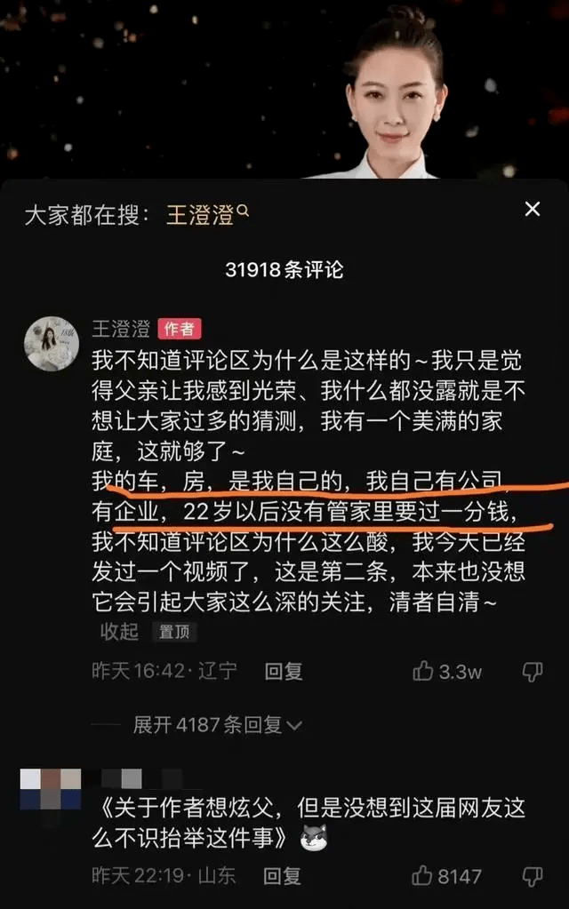 7月16日晚,“王澄澄”相关话题引发网友关注。面对网友的质疑,“王澄澄”强调她的房和车都是自己买的,自22岁起没拿过家里一分钱,都是自己创业所得。对此,有网友调侃“一分未花赵德汉,白手起家王澄澄”。