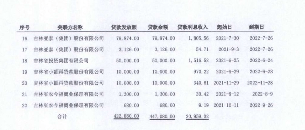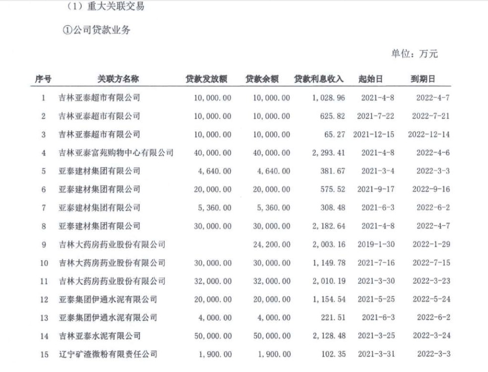 此外,据城市金融报.华网梳理,亚泰集团是吉林银行最重要的关联交易方。2021年数据显示,吉林银行对亚泰 集团及其关联公司发放的贷款总额高达34.9亿,占该行关联贷款的82.5%。