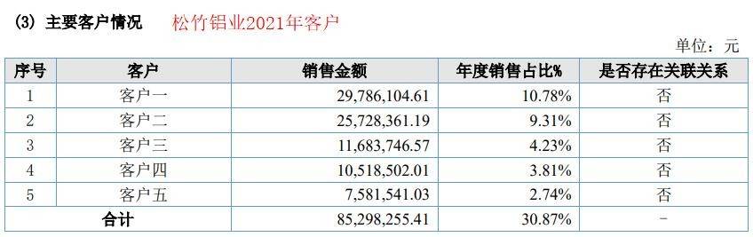 据松竹铝业2021年年报,其产品分类为建筑型材和工业型材,主营业务收入为27,473.62万元,未具名披露的前五名客户的销售额依次为2,978.61万元、2,572.84万元、1,168.37万元、1,051.85万元和758.15万元。以豪江智能披露的采购额来计算,占松竹铝业当期型材产品营业收入的比例约为4.27%,同时比松竹铝业对第三名客户的销售金额多了3.82万元。