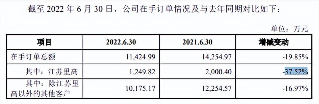 江苏里高智能家居有限公司(简称:江苏里高)为公司报告期内第一大客户,其系梦百合家居科技股份有限公司(603313.SH)(简称:梦百合)的控股子公司,报告期各期,豪江智能占梦百合体系内采购同类产品的比重分别为80%、99.7%、100%(剔除向其他供应商的备件采购金额4.78万元)、99.6%;2021年度梦百合亏损达2.76亿元。截至2022年5月31日,公司来自江苏里高的在手订单金额为886.63万元,与去年同期相比下滑54.57%,公司对江苏里高的应收账款逾期金额为1,594.71万元。