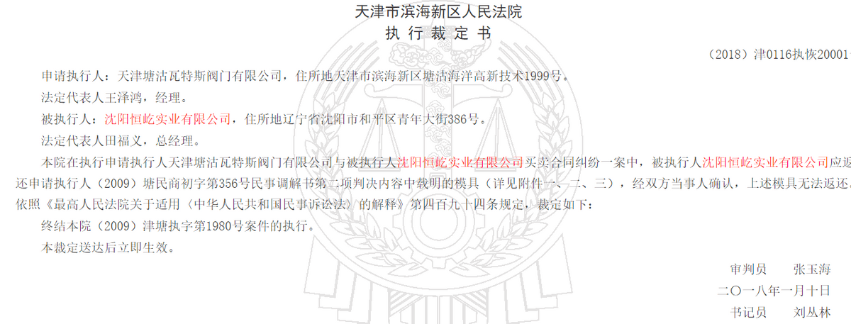 沈阳恒屹实业有限公司为公司的客户,曾有一次与天津塘沽瓦特斯阀门有限公司的买卖合同纠纷被实施强制执行。