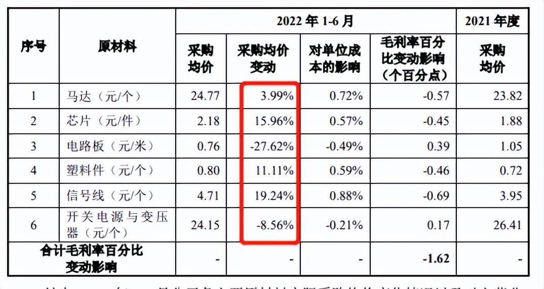 2022年1-6月,采购均价上升的主要原材料包括马达、芯片、塑料件、信号线,较2021年采购均价变动分别为3.99%、15.96%、11.11%、19.24%,对单位成本的影响分别为0.72%、0.57%、0.59%、0.88%,对主营业务毛利率的影响分别为-0.57个百分点、-0.45个百分点、-0.46个百分点、-0.69个百分点,合计影响-2.17个百分点。